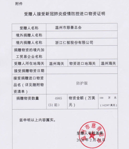 此外,面對(duì)全國疫情形式嚴(yán)峻,仁智股份勇?lián)鐣?huì)責(zé)任,為了支持抗擊肺炎疫情,防疫特別工作小組迅速調(diào)集全國各地員工,集一切力量選找口罩、防護(hù)服等相關(guān)物資采購渠道,在歷經(jīng)物資緊缺、運(yùn)輸受限、時(shí)政多變等波折后,公司終于成功從香港采購到一批醫(yī)用防護(hù)服,并于3月3日抵達(dá)疫情重災(zāi)區(qū)溫州,順利捐贈(zèng)予溫州慈善總會(huì)。