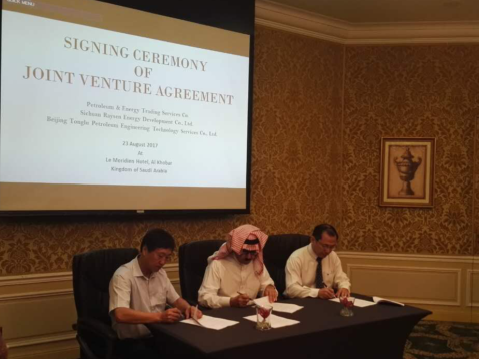 沙特是名副其實的“石油王國”,其石油儲量位列世界三甲,其產(chǎn)量則居世界首位,其金融體系完善發(fā)達(dá),財稅政策極具競爭力,稅收便易度方面排名世界第三位。在“2030愿景”政策大背景下,沙特政府鼓勵當(dāng)?shù)鼗a(chǎn)和服務(wù),以減少國家經(jīng)濟(jì)對石油出口的依賴,同時為快速增長的人口提供更多的就業(yè)機(jī)會。為抓住沙特政府經(jīng)濟(jì)改革的歷史性機(jī)遇,在前期充分調(diào)研和磋商的基礎(chǔ)上,我司總裁助理方清先生、沙特Petroleum and Energy Trading Services Est. 公司總裁ADEL先生和北京同路石油工程技術(shù)服務(wù)公司總裁袁繼存先生一致同意:三方?jīng)Q定在沙特阿拉伯王國成立合資公司,從事油田技術(shù)服務(wù)、產(chǎn)品生產(chǎn)、國際貿(mào)易等業(yè)務(wù),共同開拓沙特及中東地區(qū)市場,并于2017年8月23日(沙特當(dāng)?shù)貢r間)在沙特阿拉伯王國庫巴市LE MERIDIEN 大酒店簽署了合資協(xié)議。